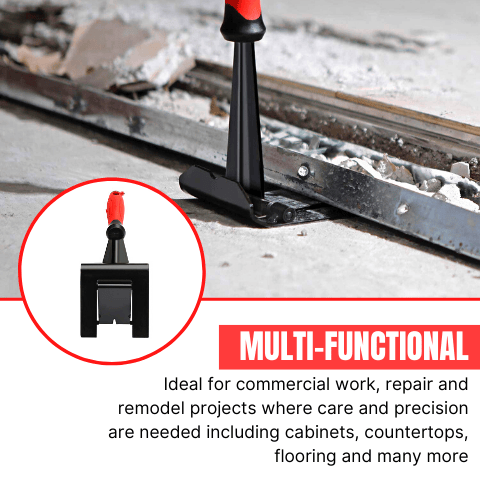 A: It’s ideal for commercial projects, repairs, and remodels that require care and precision, such as cabinets, countertops, and flooring. It can be used to remove a couple of baseboard sections, a countertop from some base cabinets, and a ceramic tile floor from a kitchen makeover. The staples can also be pryed up with the very edge.